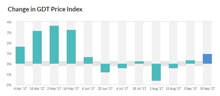 Індекс молочного аукціону Fonterra на другій вересневій сесії виріс на 0,9%. Середньозважена ціна на сесії 19 вересня зросла на 45 доларів до 3368 USD/т. Показник підтримав зростання цін на молочні жири і деяке збільшення вартості сухого незбираного молока.