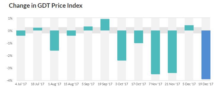 На останніх торгах GDT ціни знизилися на всі молочні продукти. Це стало найсильнішим скороченням показників з березня 2017 року.