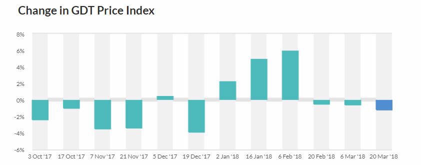 Зниження цін на новозеландському молочному аукціоні GlobalDairyTrade набирає обертів. Індекс аукціону за підсумками торгів 20 березня знизився на 1,2%.