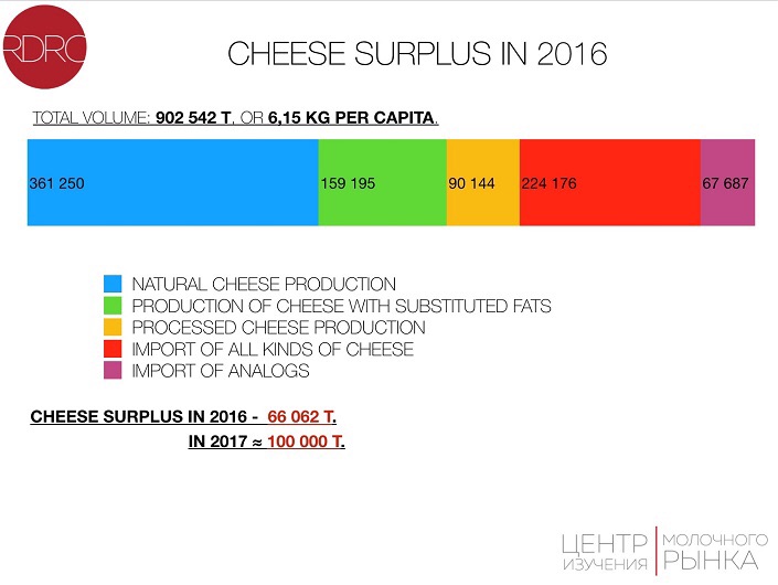У 2016-17 року ринок сиру в Росії зіштовхнувся з наявністю значних надлишків, розповів експерт. За попередніми оцінками обсяг надлишків в 2017 році досяг 100 тис. тонн. Це пов’язано як із зростанням виробництва, так і з падінням споживання, а також і реекспортом через Білорусь дешевих сироподібних продуктів.
