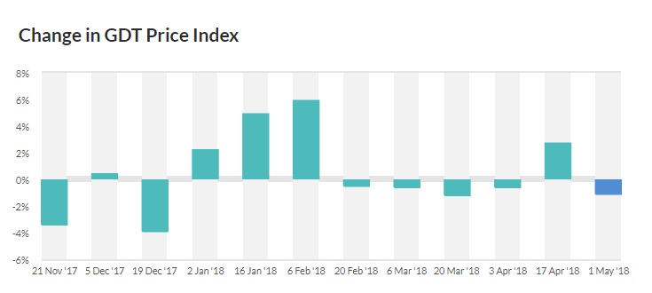 Індекс цін біржових молочних продуктів (GDT) знизився на торгах 1 травня на 1,1%.