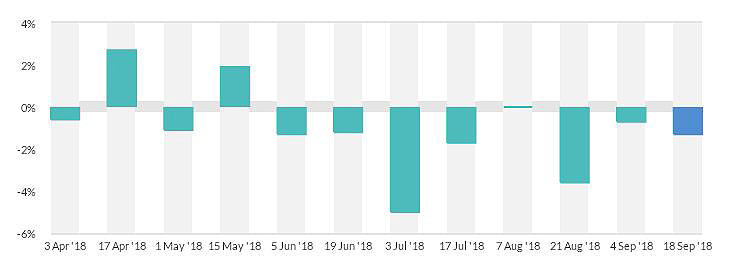 • Зниження індексу на торгах 18 вересня стало сьомим (!) на останніх восьми сесіях, враховуючи аукціон з нульовим відхиленням. У порівнянні з торгами аналогічного періоду минулого року, ціна СОМ опустилася «всього лише» на 1,8%, в той час як масло подешевшало на 30% (!). Новозеландці просять також брати до уваги зниження курсу новозеландського долара до USD на 3,7% (вересень до вересня).