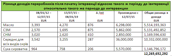 Для переробників результатом перевиробництва, яке призвело до державного втручання, стало зниження доходу за період інтервенцій на 12,3 мільярда євро . Ми не бачимо доказів того, що ціни через це стабілізувалися. Фактором, який допоміг запобігти подальшому падінню загальних доходів, було безпрецедентне збільшення цін на вершкове масло, яке, однак, відбулося не завдяки створенню інтервенційних запасів.
