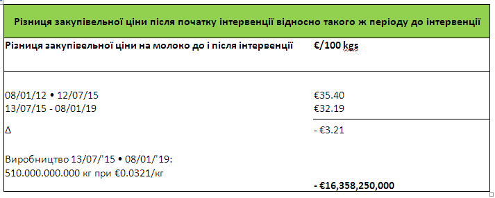 Для молочних фермерів ціна на молоко після інтервенцій знизилася на 9%, і різниця склала в той період 16,3 млрд євро.