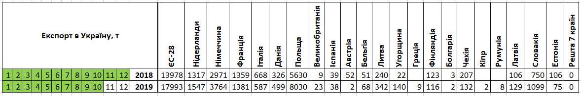 На даний момент доступні дані за неповний 2019 рік (січень – жовтень).  За 10 місяців поточного року обсяг сиру, що експортується з ЄС до України, вже перевищив рівень повного 2018 року.
