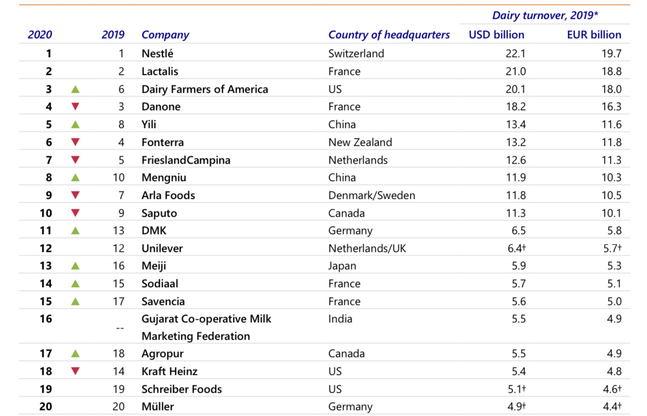 І навпаки, лідер рейтингу останніх років вирішив продати деякі зі своїх непрофільних молочних активів. Компанія #Nestlé оптимізувала свій американський бізнес з виробництва морозива вартістю 1,8 млрд доларів США разом з іншими активами (деякі з яких були придбані Lactalis), що призвело до значного скорочення розриву між двома провідними світовими молочними компаніями. Nestlé залишається на першій позиції свіжого рейтингу, але розрив між нею і Lactalis в 2018 році скоротився з 3,5 млрд. доларів до 1,1 млрд. доларів в 2019 році.