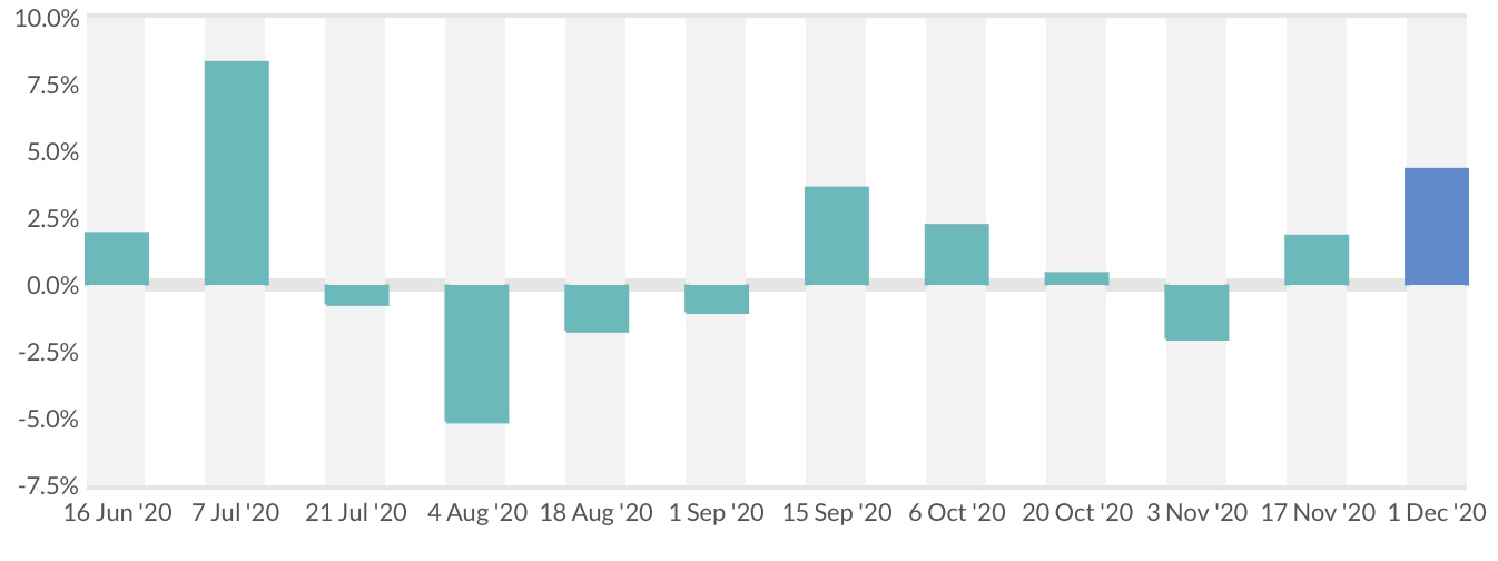 Значення середньозваженого індексу цін на торгах 01.12.2020 підвищилося на 4,3%, або 42 пункту, до 1 012 пунктів. (На початку грудня 2019 року – 1 065 пунктів). Середньозважена індикативна ціна на молокопродукти склала за підсумками останніх торгів 3 261 USD / т. Обсяги торгів (32,1 тис. т) в порівнянні з рівнем початку грудня 2019 р залишаються нижчими на 11,6%, в порівнянні з попередніми торгами – на 9,7%.