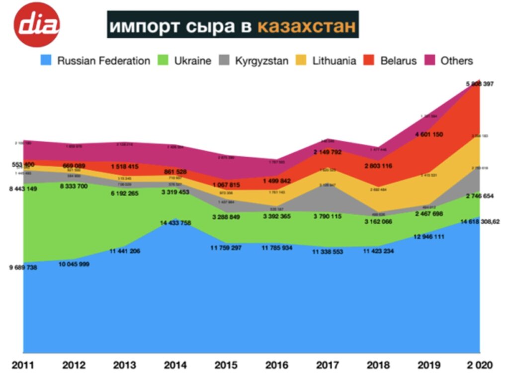 За словами директора Центру вивчення молочного ринку, Михайла Міщенка, близько 50% імпорту сирів до Казахстану останніми роками припадає на РФ.