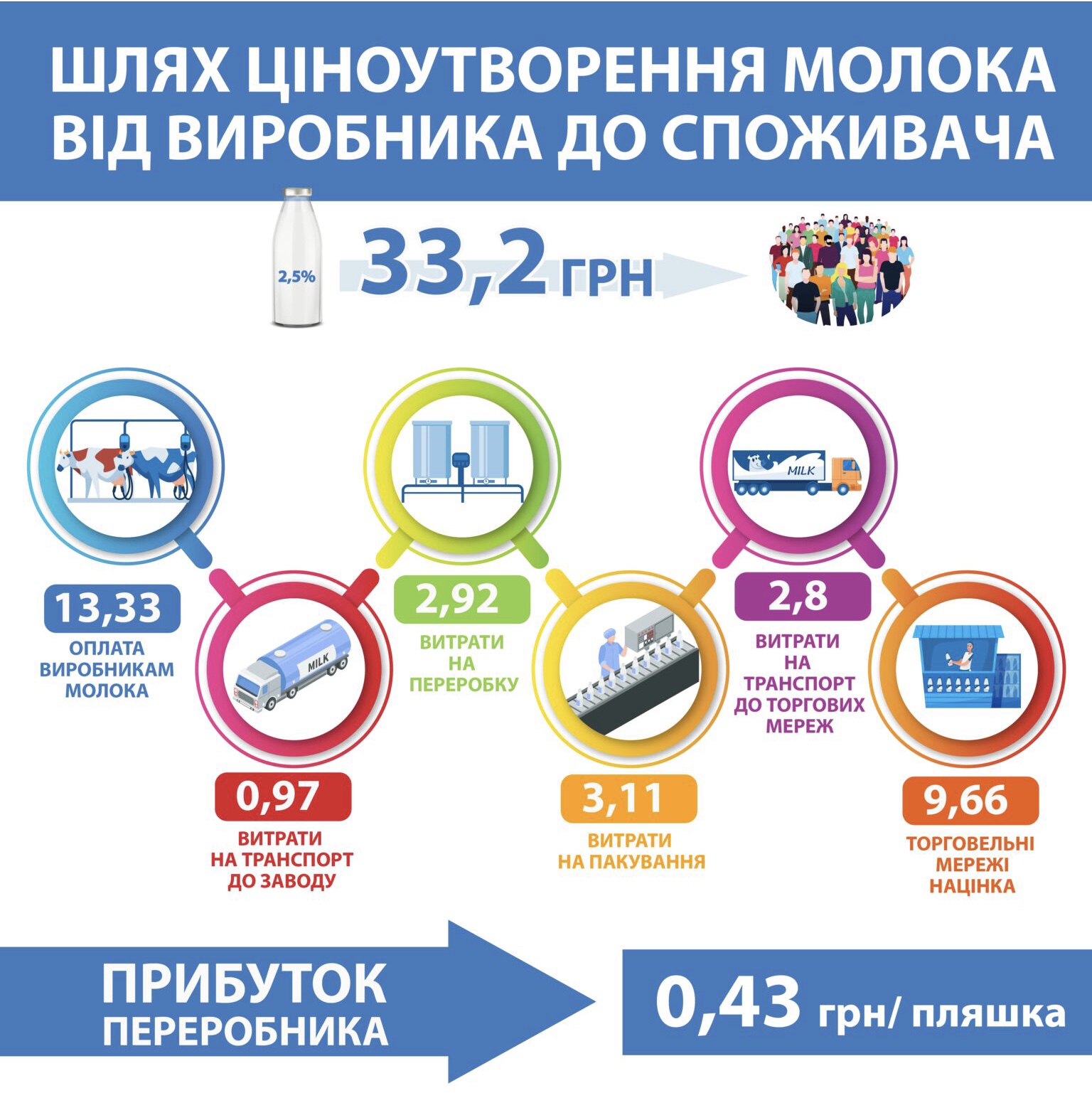 - 3.33 грн отримує переробник, щоб покрити витрати по переробці молока і маркетингу, заплатити податки і отримати прибуток, який складає 0.43 грн/л