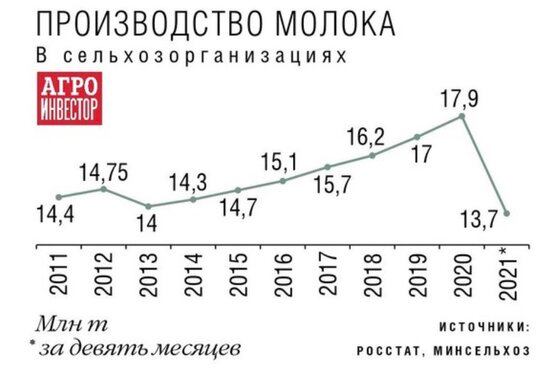 «У 2021 році в молочній галузі в єдину хвилю склалася ціла низка негативних факторів, які в сукупності призвели до скорочення виробництва, — продовжує Груздєв. — Спочатку різке зростання собівартості, не відігране підвищенням цін на молоко, змусило господарства економити та згортати плани з інвестицій, а потім додався фактор погоди: спочатку спека вдарила по надоях та відтворенню стада, а потім дощі та ранній сніг — по якості кормів».