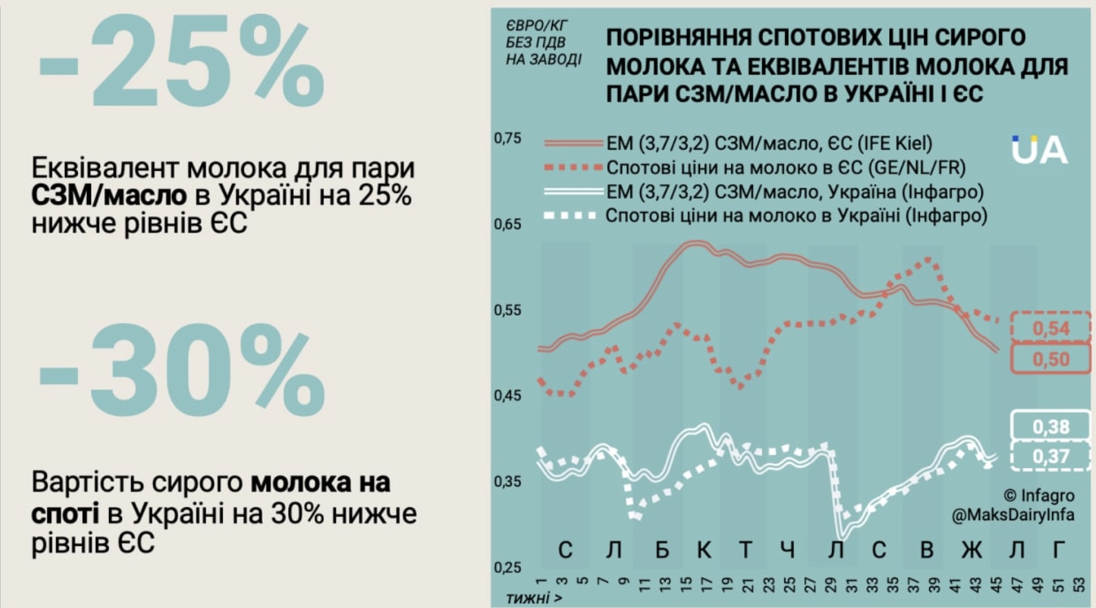 На поточному тижні знову спостерігаємо зближення українських та європейських рівнів молочних цін. Різниця вартості українського сирого молока на споті проти ЄС складає -30% (минулий тиждень -32%), різниця ЕМ СЗМ/масло складає -25% (минулий тиждень -27%).