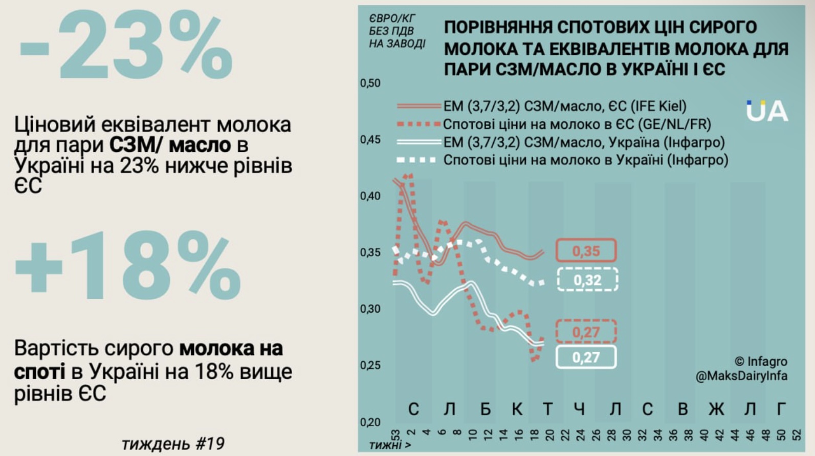 На поточному тижні різниця вартості українського сирого молока на споті проти ЄС складає +18% (минулий тиждень +27%), різниця ЕМ СЗМ/масло складає -23% (минулий тиждень -22%).