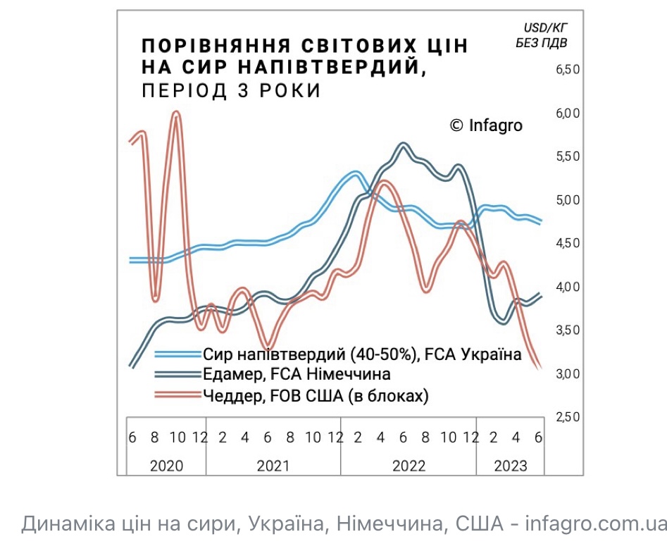 Інші тренди спостерігались на ринку сирів в США. Інфляція також вплинула на Штати в минулому році, проте, зниження цін в середині року допомогло стимулювати як внутрішній попит, так і зовнішню торгівлю. За підсумками 2022 року для американського ринку характерний ріст як виробництва сирів, так і реалізації, тобто внутрішніх та зовнішніх продажів. Даний тренд був характерним і для першої половини 2023 року, таким чином, сировари США частково замістили на світовому ринку своїх конкурентів, ЄС та Нову Зеландію, експорт яких, навпаки, знижувався останні півтора роки. Але не все так райдужно і в Сполучених Штатах, ріст пропозиції сировини підтримує нарощування темпів виробництва сирів, але зовнішній попит скорочується. Дисбаланс штовхає ціни на американські сири донизу, позначка в 3000 USD/t вже подолана, що, в свою чергу, також рухає закупівельні ціни на сире молоко класу 3, призначеного як раз під виробництво сирів (сировина оцінюється вже на рівні 30 центів, найнижчий показник з часів провалу на початку епідемії COVID).