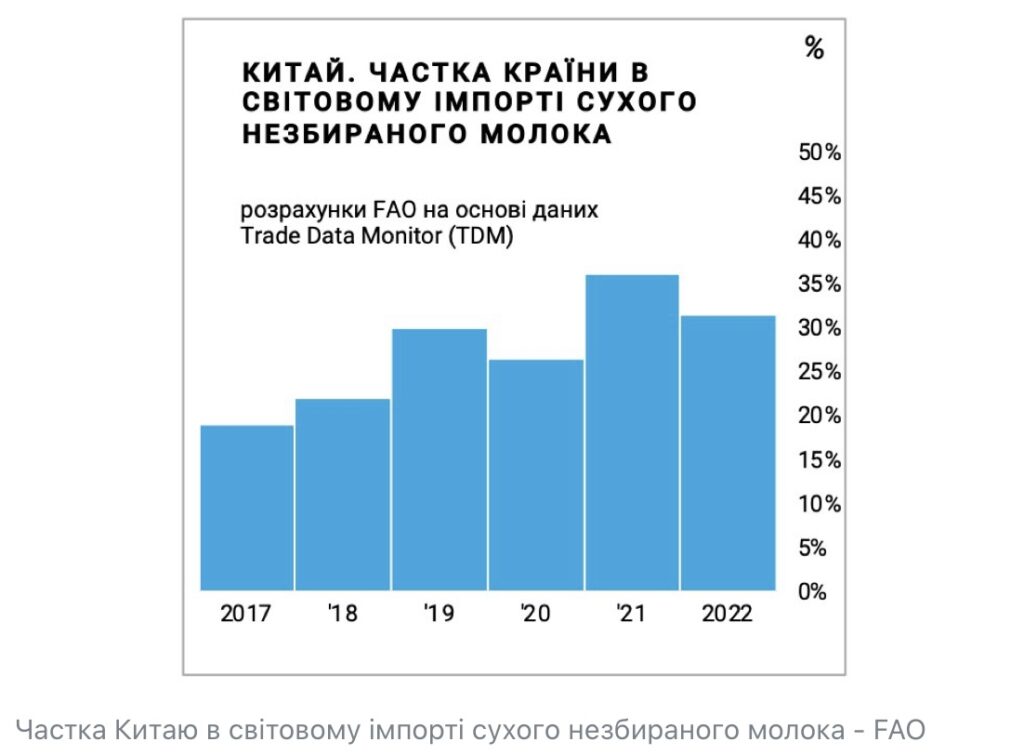 Китай є ключовим світовим покупцем молочних товарів. Особливе місце в китайському імпорті займає сухе незбиране молоко. Його частка складає третину в глобальній торгівлі СНМ, тому активність китайських покупців пропорційно впливає на загальний попит і ціни товару в світі. Однак, останні роки ситуація почала активно змінюватись, у першу чергу, за рахунок держпрограми нарощування виробництва сирого молока в Китаї. Країна досі є дефіцитною по молоку, але падіння споживчого попиту, викликане обмеженнями жорсткого карантину і зниженням економічного потенціалу, а також ріст власного виробництва сировини призвели до активізації локальної пропозиції молочних продуктів та біржових позицій. Сухе незбиране молоко виявилося головним товаром, виробництво якого активно збільшили китайські заводи, тим самим знижуючи потребу у зовнішніх закупівлях. Результатом цього в 2022 році стало падіння імпорту СНМ Китаєм до рівня 700 тис. тонн, що виявилось на 17% нижче, ніж у 2021 році. Подібні тенденції прослідковуються і у поточному календарному році.