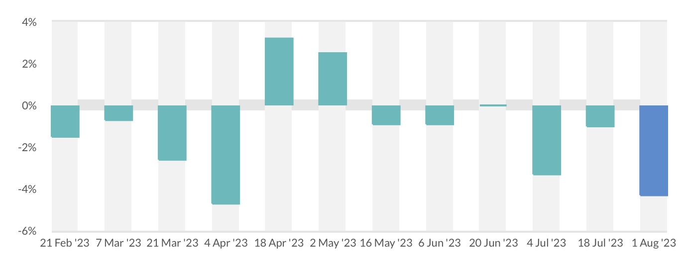Останні торги GDT, що відбулися 1 серпня, продемонстрували зниження цінового індексу на 4,3%. Індекс має загальний низхідний тренд з березня 2022 року з деяким незначним відновленням на цьому проміжку часу.