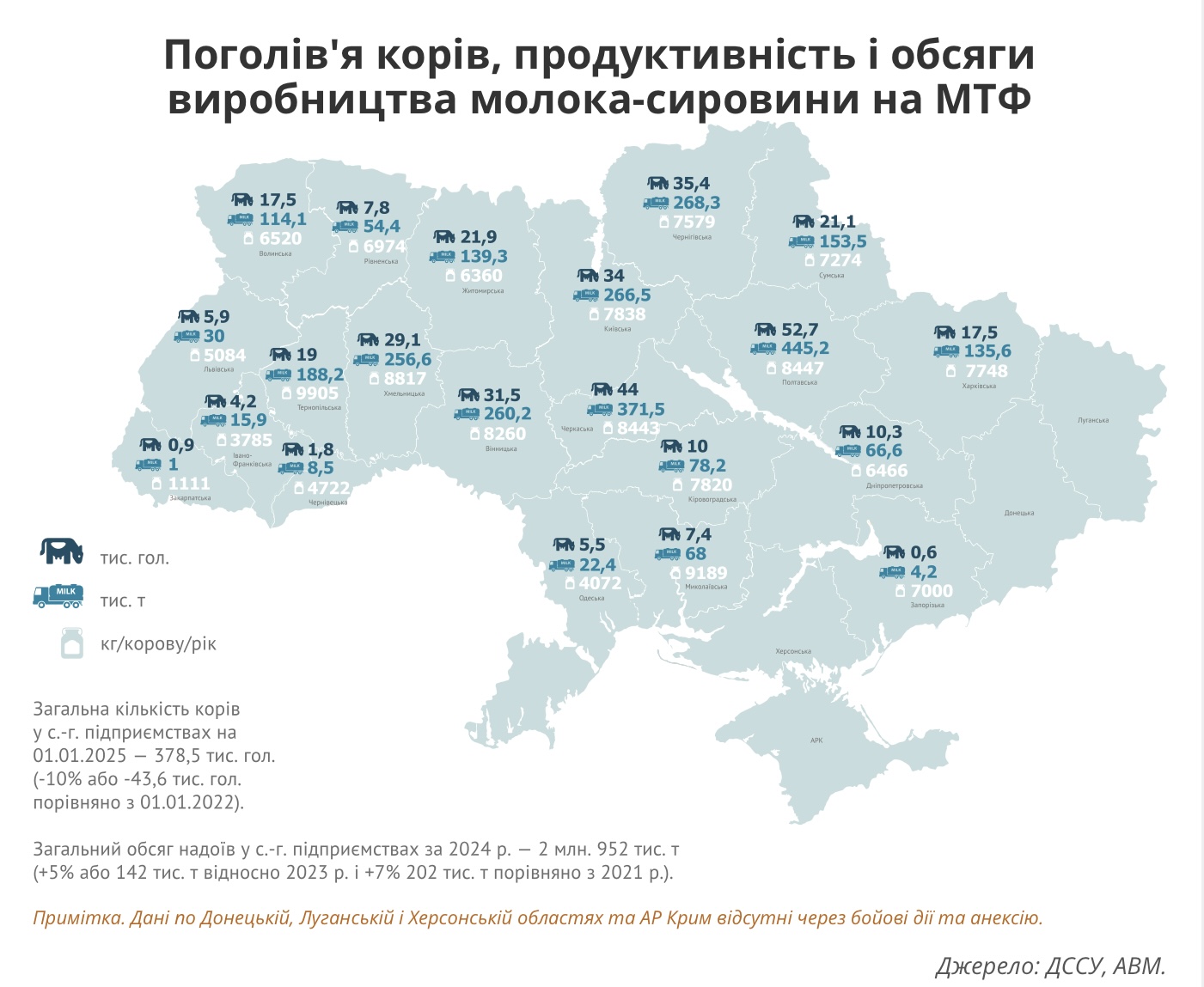 “Зростання виробничих витрат, посилення регуляторних вимог, непередбачувані кліматичні зміни та поширення хвороб тварин уповільнили темпи виробництва молока-сировини в молочних регіонах світу. Закупівельні ціни підвищились, а готова продукція подорожчала. Україна не стала винятком. Однак, попри зазначені глобальні виклики, а також наслідки повномасштабної війни з росією, українські молочнотоварні ферми демонструють стійкість, покращують продуктивність, а за обсягами надою у 2024-му перетнули довоєнні показники.”