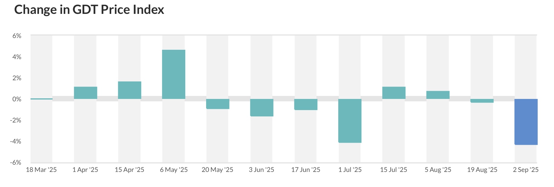 Ціновий індекс GDT зазнав значного падіння, ціни на молочну, окрім Чедера, знизились. Загальний індекс GDT впав на 4,3%.