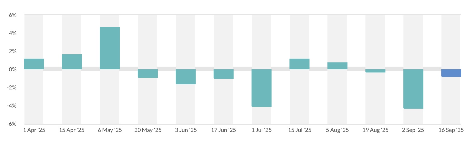 Індекс світової торгівлі молочними продуктами (GDT) продовжив зниження 16 вересня, знизившись на 0,8% до 4041 USD/т з 4043 USD/т 2 вересня.