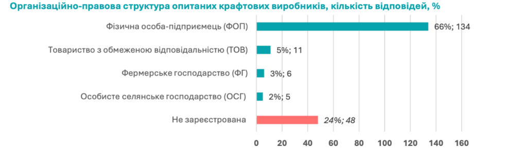 Згідно з дослідженням крафтового ринку харчових продуктів України в межах освітньо-грантового проєкту CraftUP Ukraine, проведеного онлайн-виданням AgroPortal.ua за підтримки компанії Pro-Consulting, крафтярі найчастіше реєструються як фізичні особи-підприємці (ФОП) — у 66% з усіх зареєстрованих, майже чверть підприємців працюють у тіні (не зареєстрована підприємницька діяльність).