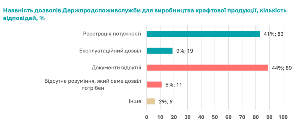 41% респондентів зазначили, що мають офіційну реєстрацію потужностей виробництва або експлуатаційний дозвіл на ведення діяльності з переробки/виробництва продукції. Декілька респондентів поки не мають документів, проте знаходяться в процесі їх оформлення.